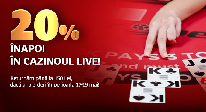 2. Primești înapoi 20% până la 150 Lei Bonus Live Casino, în eventualitatea în care înregistrezi pierderi de peste 50 Lei (cazul în care diferența dintre câștigurile realizate și pariurile plasate în perioada 17 - 19 mai va fi negativă)!