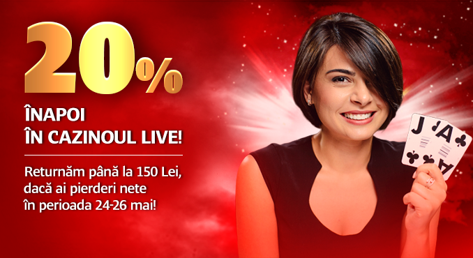 2. Primești înapoi 20% până la 150 Lei Bonus Live Casino, în eventualitatea în care înregistrezi pierderi de peste 50 Lei (cazul în care diferența dintre câștigurile realizate și pariurile plasate în perioada 24 - 26 mai va fi negativă)!