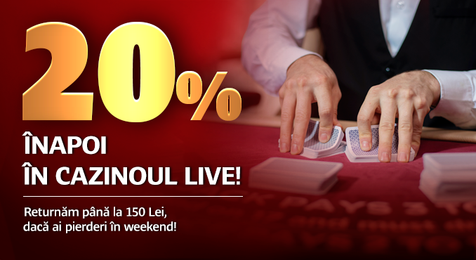 - Se acordă un bonus de 20% din valoarea pierderilor nete înregistrate în perioada promoției, pe conținutul din secțiunea „Live Casino” a site-ului.