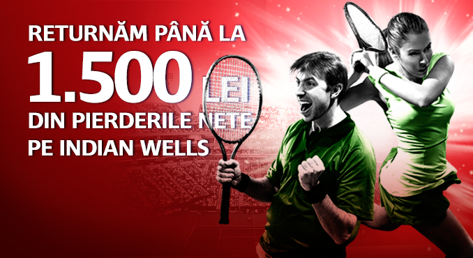 În perioada 12-18 martie înregistrezi pierderi nete din bani reali de cel puțin 1.000 Lei pe evenimente din Indian Wells – primești 10% din pierderile nete până la maximul de 1500 lei cu rulaj de 3;
