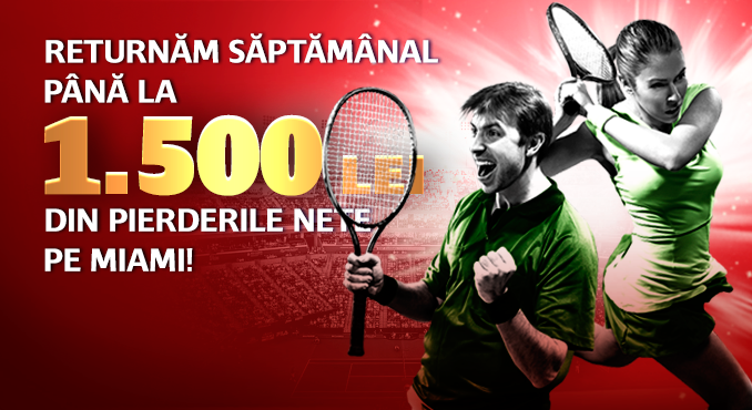 În perioada 26-31 martie înregistrezi pierderi nete din bani reali de cel puțin 1.000 LEI pe evenimente din Miami Open – primești 10% din pierderile nete până la maximul de 1.500 LEI cu rulaj de 3;