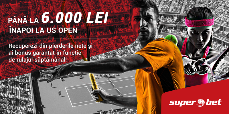 - Înregistrează pierderi nete din bani reali de cel puțin 5.000 LEI, în secțiunile “Sport”/Pre-meci și/sau “Pariuri Live”/Live, în perioadele 26 august - 01 septembrie și 02 - 08 septembrie pe bilete care să conțină cel puțin un eveniment de la US Open (simplu feminin, simplu masculin; dublu feminin, dublu masculin) și primești 20% din pierderile nete avute sub formă de bonus cu rulaj de 1, până la maximul de 2.000 LEI.