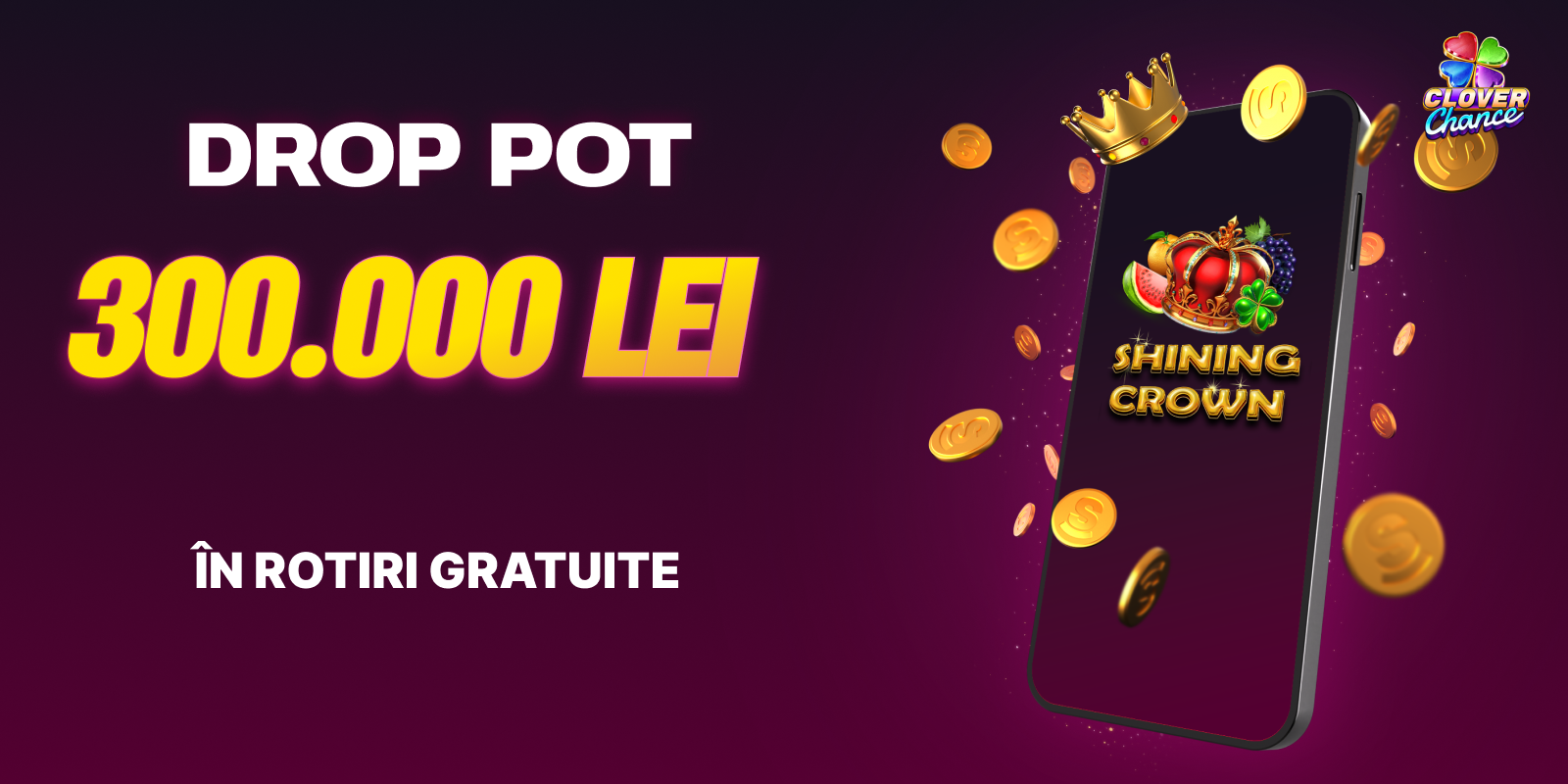 - Primești o parte din premiul de 300.000 de lei, sub formă de Rotiri Gratuite la Shining Crown Clover Chance, dacă respecți pașii de mai sus.